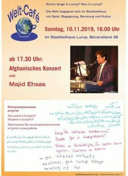 Schon lange in Lurup? Neu in Lurup? Die Welt begegnet sich im Stadtteilhaus mit Begegnung, Beratung und Kultur. Ab 17.30 Uhr Afghanisches Konzert mit Zia Rostami